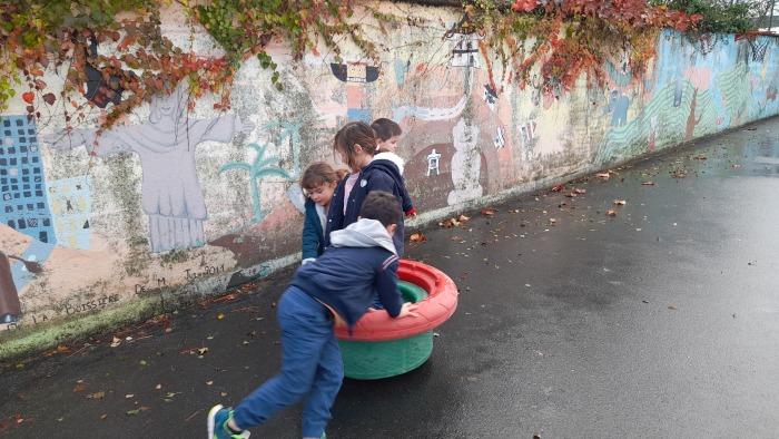 Pendant cette période, nous découvrons notre corps à travers différentes activités.Nous nommons les différentes parties du corps en traçant notre corps au sol. Nous apprenons les articulations en sport : en se tenant les chevilles pour former des chenilles. Nous apprenons à maîtriser notre axe central la colonne vertébrale en cheminant sur un parcours en gardant la tête bien droite. Nous bougeons, sautons et créons des parcours à l’aide de roues (matériel loué par l’UGSEL pendant toute la période).