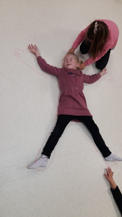 Pendant cette période, nous découvrons notre corps à travers différentes activités.Nous nommons les différentes parties du corps en traçant notre corps au sol. Nous apprenons les articulations en sport : en se tenant les chevilles pour former des chenilles. Nous apprenons à maîtriser notre axe central la colonne vertébrale en cheminant sur un parcours en gardant la tête bien droite. Nous bougeons, sautons et créons des parcours à l’aide de roues (matériel loué par l’UGSEL pendant toute la période).