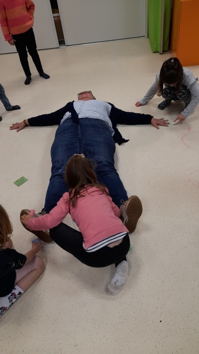Pendant cette période, nous découvrons notre corps à travers différentes activités.Nous nommons les différentes parties du corps en traçant notre corps au sol. Nous apprenons les articulations en sport : en se tenant les chevilles pour former des chenilles. Nous apprenons à maîtriser notre axe central la colonne vertébrale en cheminant sur un parcours en gardant la tête bien droite. Nous bougeons, sautons et créons des parcours à l’aide de roues (matériel loué par l’UGSEL pendant toute la période).