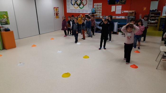 Pendant cette période, nous découvrons notre corps à travers différentes activités.Nous nommons les différentes parties du corps en traçant notre corps au sol. Nous apprenons les articulations en sport : en se tenant les chevilles pour former des chenilles. Nous apprenons à maîtriser notre axe central la colonne vertébrale en cheminant sur un parcours en gardant la tête bien droite. Nous bougeons, sautons et créons des parcours à l’aide de roues (matériel loué par l’UGSEL pendant toute la période).