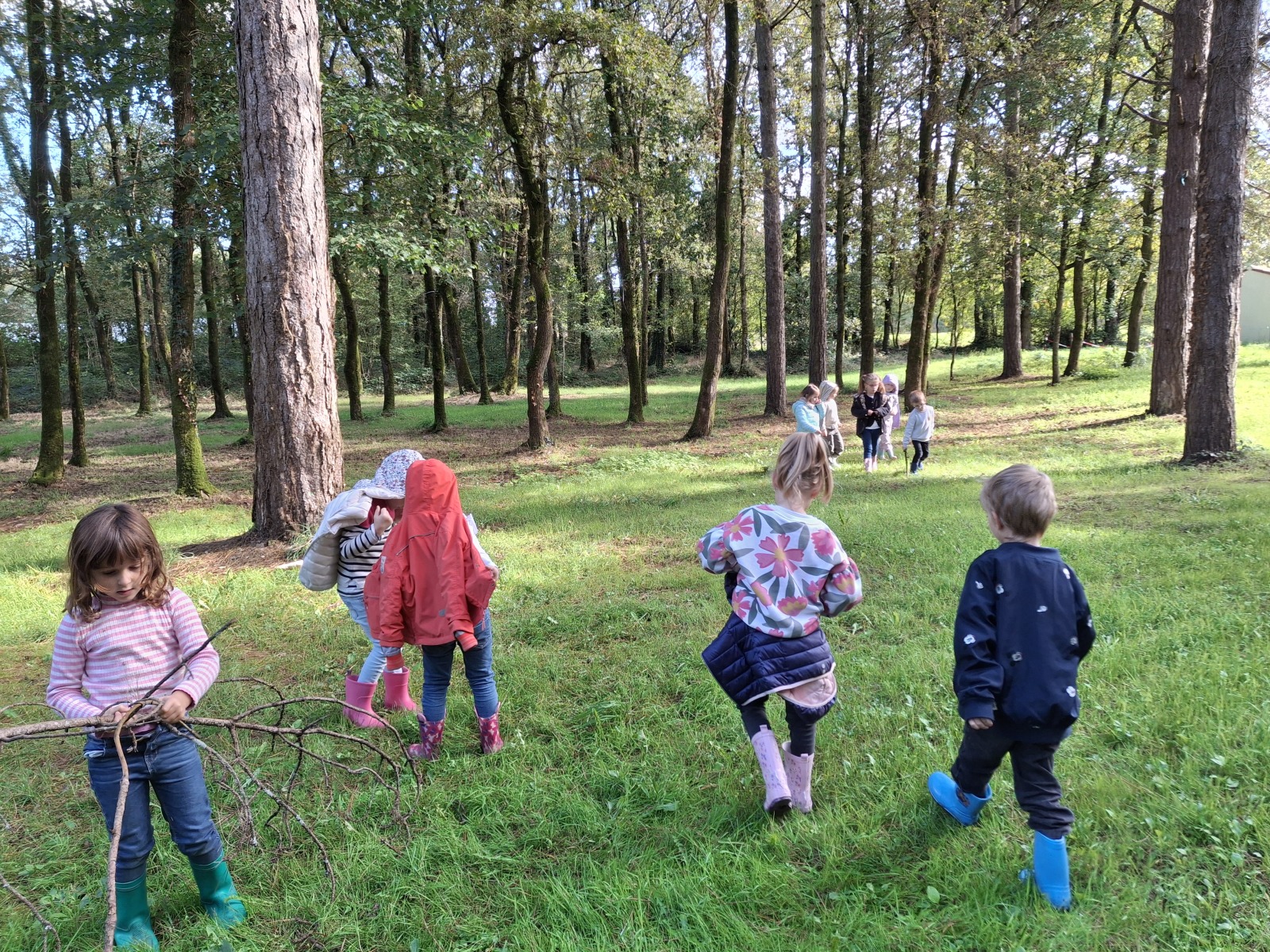 Ce vendredi, avec ce beau soleil, nous sommes allés travailler au bois des brosses.Avec des mamans, nous avons fait une chasse aux trésors de la nature : feuille, plume, gland, terre,…