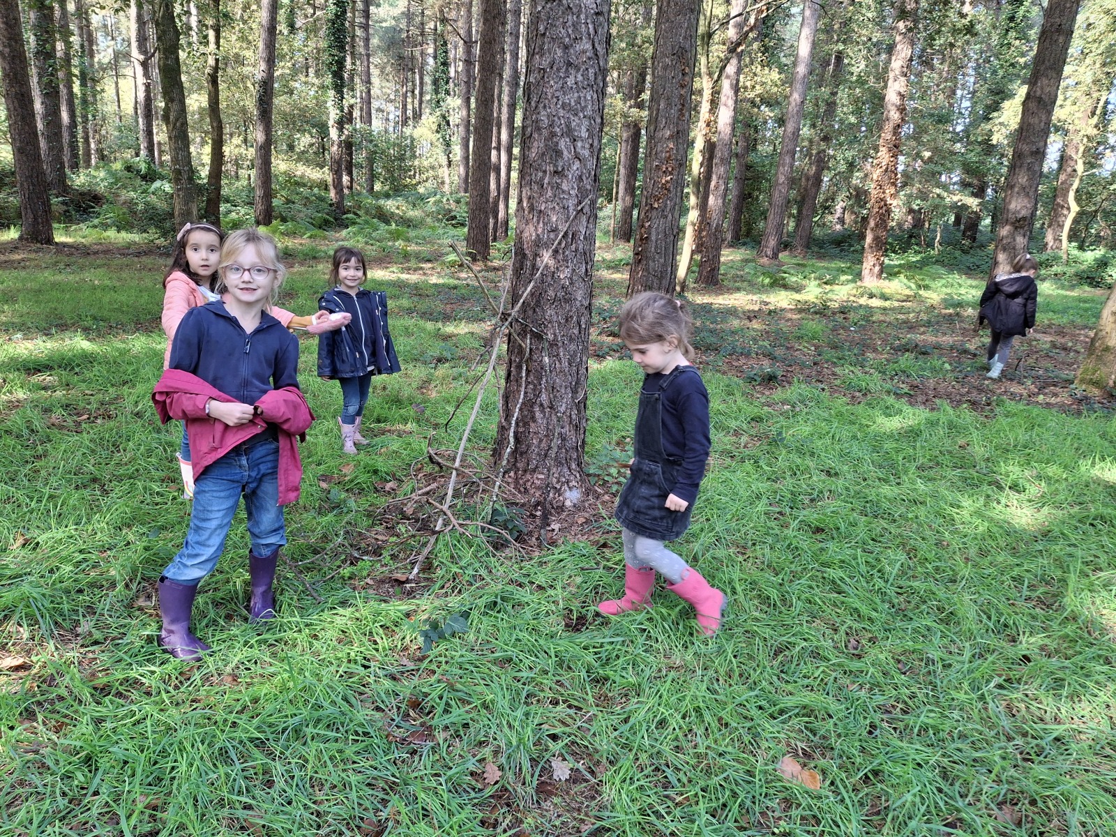 Ce vendredi, avec ce beau soleil, nous sommes allés travailler au bois des brosses.Avec des mamans, nous avons fait une chasse aux trésors de la nature : feuille, plume, gland, terre,…