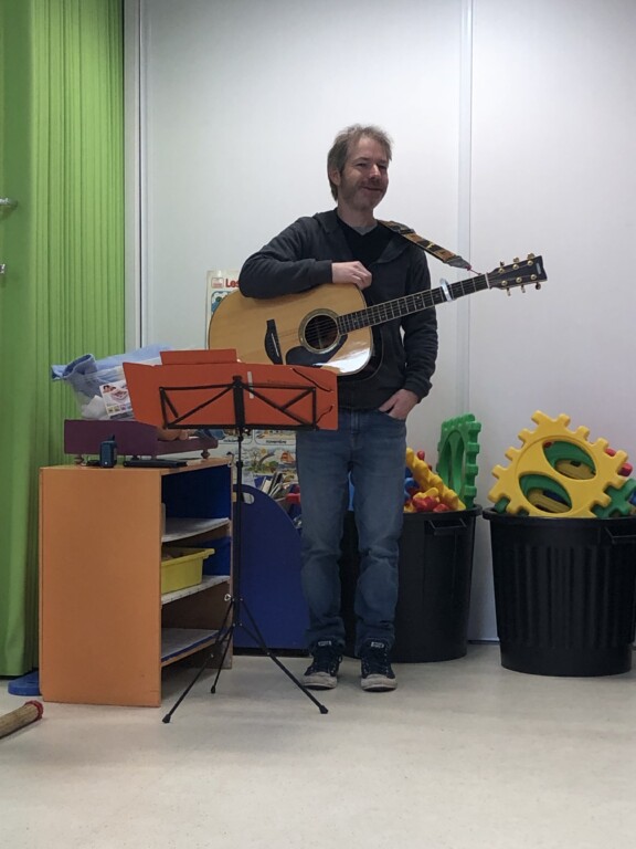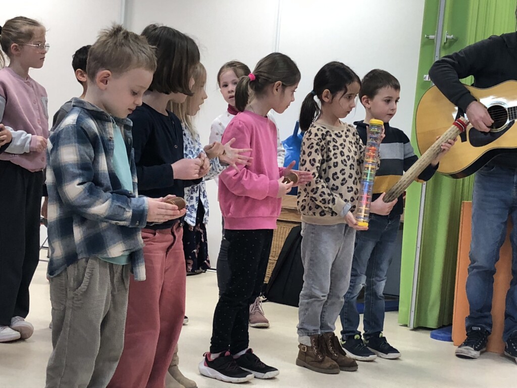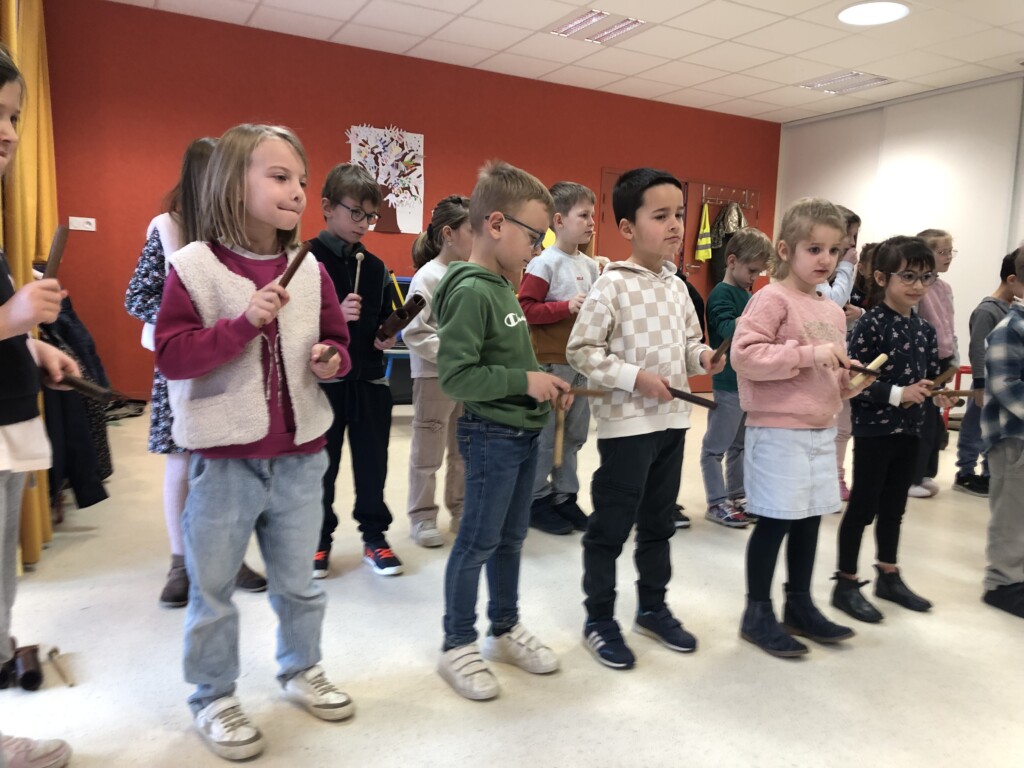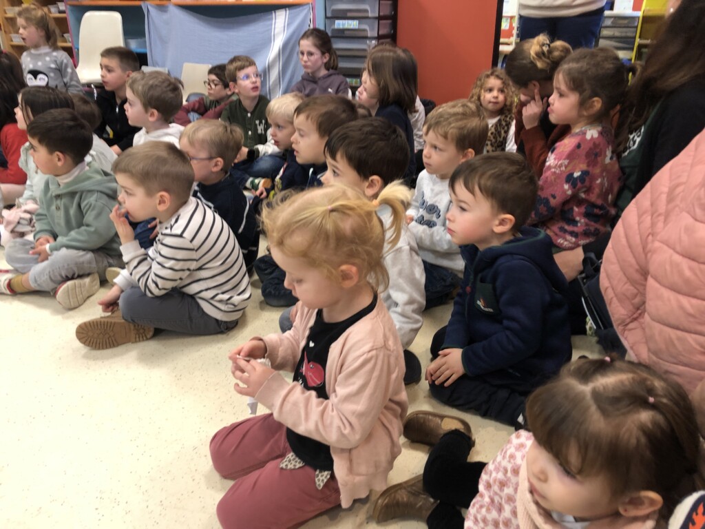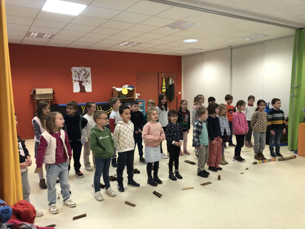 Avec Claude, l’intervenant musique, les grands nous ont raconté une histoire ponctuée de bruits et d’instruments à percussion : triangle, claves, bâton de pluie ….et nous ont interprété plusieurs chansons;