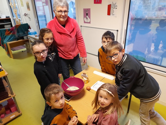 Jeudi, les élèves de CE2 nous ont rejoints pour confectionner des galettes avec l’aide de mamies et de mamans.En suivant la recette ci-dessous, chaque groupe a pu réaliser sa galette. Merci aux accompagnatrices.
