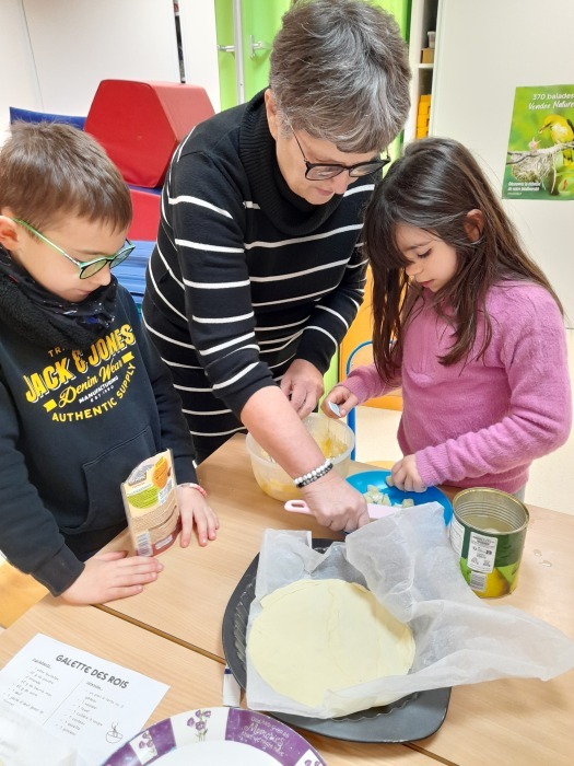 Jeudi, les élèves de CE2 nous ont rejoints pour confectionner des galettes avec l’aide de mamies et de mamans.En suivant la recette ci-dessous, chaque groupe a pu réaliser sa galette. Merci aux accompagnatrices.