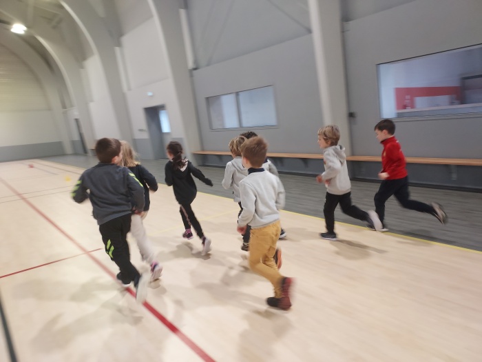 Chaque semaine, nous nous entrainons à courir, à faire des parcours avec slaloms et sauts de haies, nous réalisons des gammes pour bien progresser en course et en coordination.  Nous avons aussi travaillé le saut en hauteur sur des tapis. Enfin, nous avons testé différents lancers (médecine ball, vortex, anneau…).