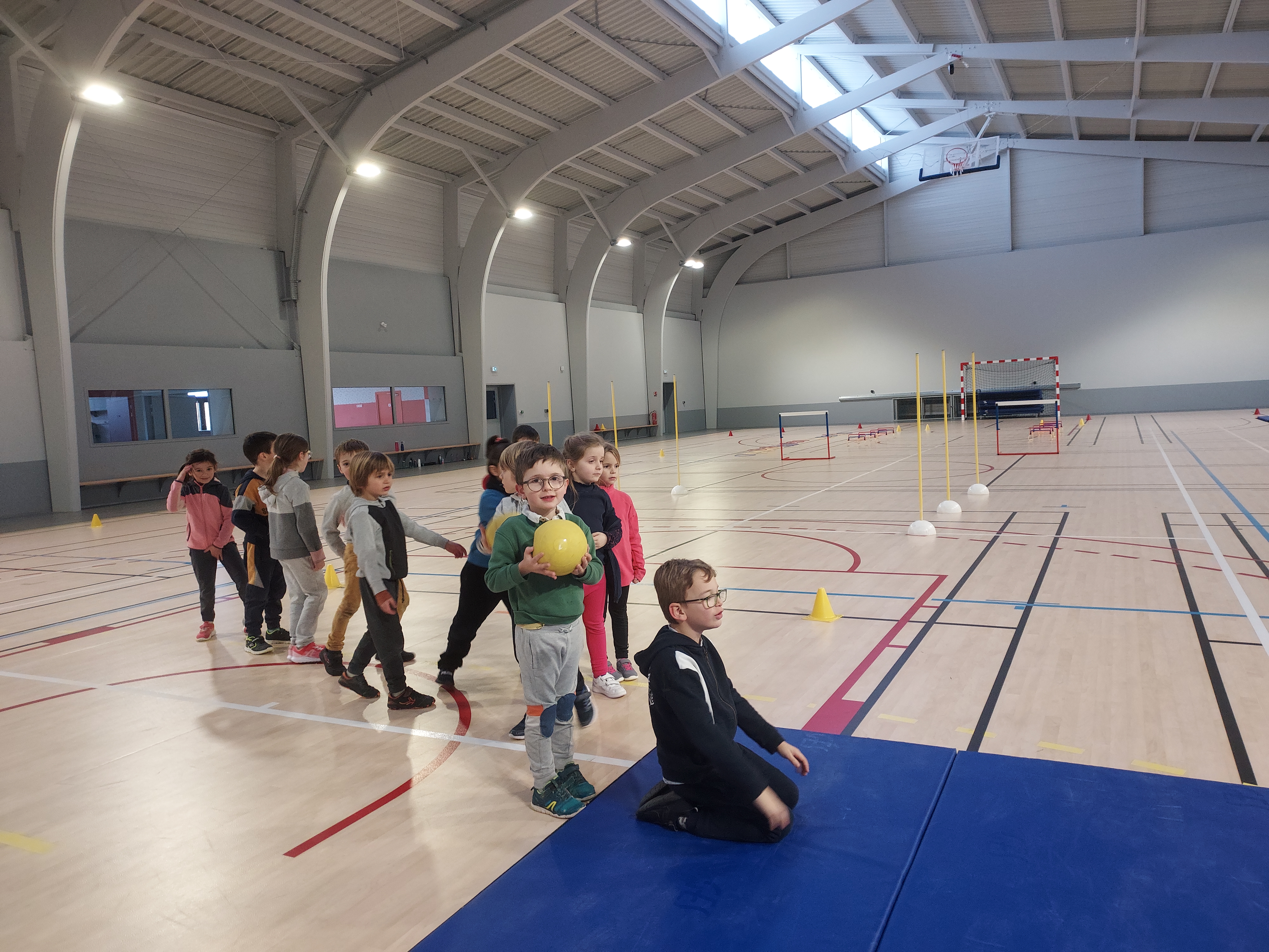 Chaque semaine, nous nous entrainons à courir, à faire des parcours avec slaloms et sauts de haies, nous réalisons des gammes pour bien progresser en course et en coordination. Nous avons aussi travaillé le saut en hauteur sur des tapis. Enfin, nous avons testé différents lancers (médecine ball, vortex, anneau…).
