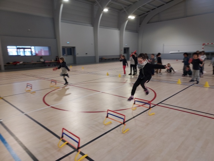 Chaque semaine, nous nous entrainons à courir, à faire des parcours avec slaloms et sauts de haies, nous réalisons des gammes pour bien progresser en course et en coordination.  Nous avons aussi travaillé le saut en hauteur sur des tapis. Enfin, nous avons testé différents lancers (médecine ball, vortex, anneau…).