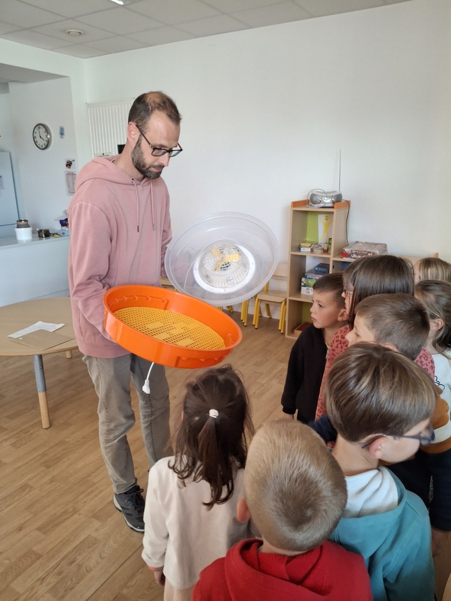 Elphège nous a expliqué comment ils ont pu naître sans la poule grâce à la couveuse, comment il leur a appris à manger et à boire. Puis nous les avons pris dans nos mains car ils doivent s’habituer au contact. Nous avons fait très attention car ils sont fragiles. Un moment magique !