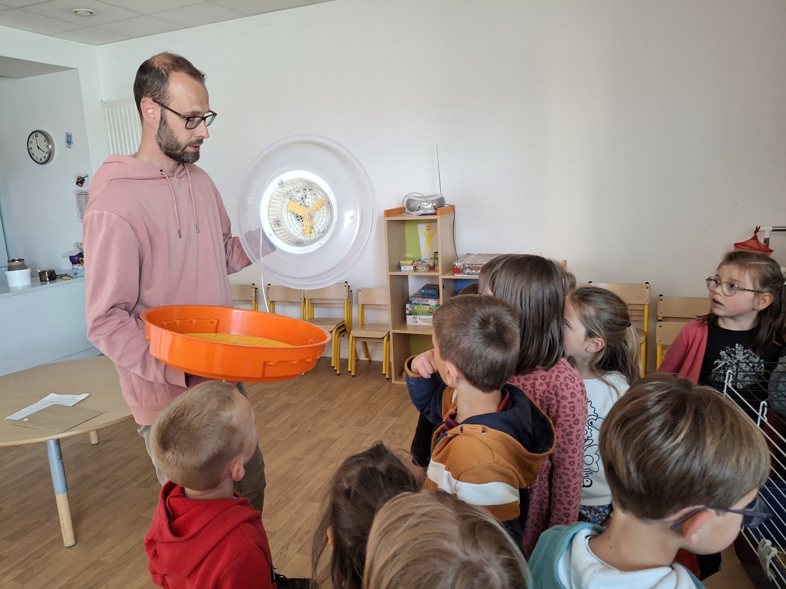 Elphège nous a expliqué comment ils ont pu naître sans la poule grâce à la couveuse, comment il leur a appris à manger et à boire. Puis nous les avons pris dans nos mains car ils doivent s’habituer au contact. Nous avons fait très attention car ils sont fragiles. Un moment magique !