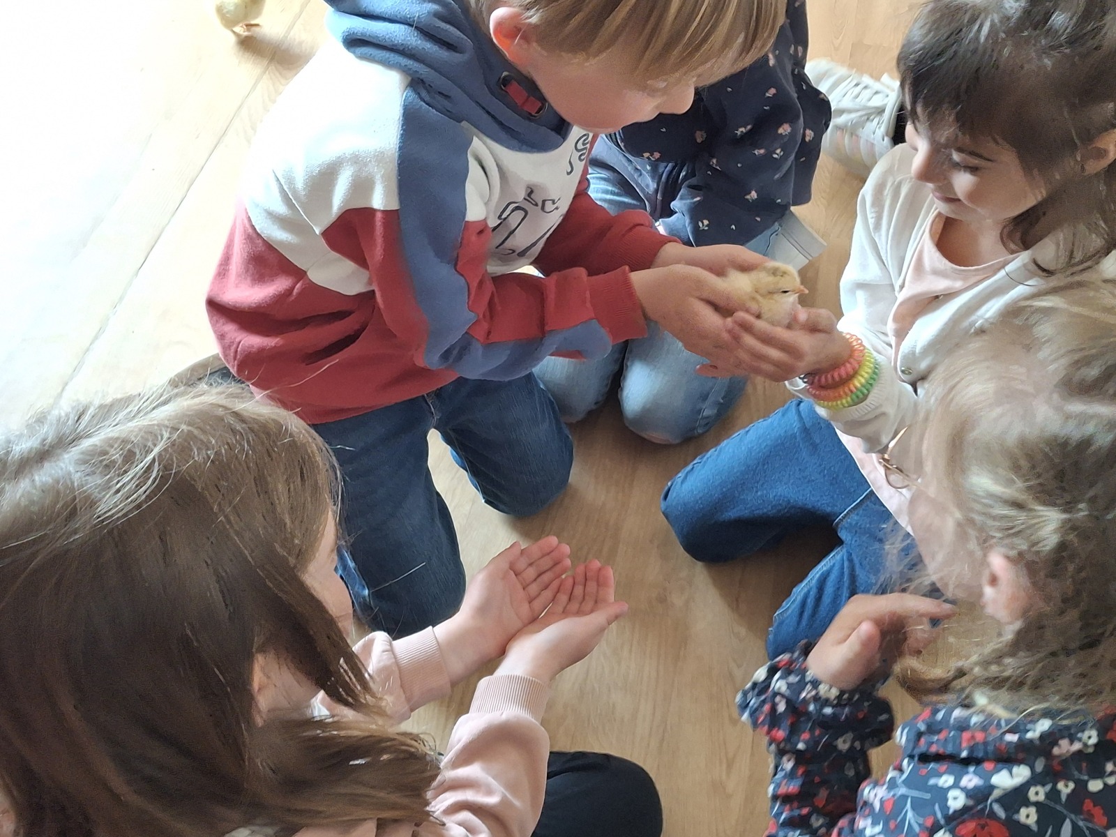 Elphège nous a expliqué comment ils ont pu naître sans la poule grâce à la couveuse, comment il leur a appris à manger et à boire. Puis nous les avons pris dans nos mains car ils doivent s’habituer au contact. Nous avons fait très attention car ils sont fragiles. Un moment magique !