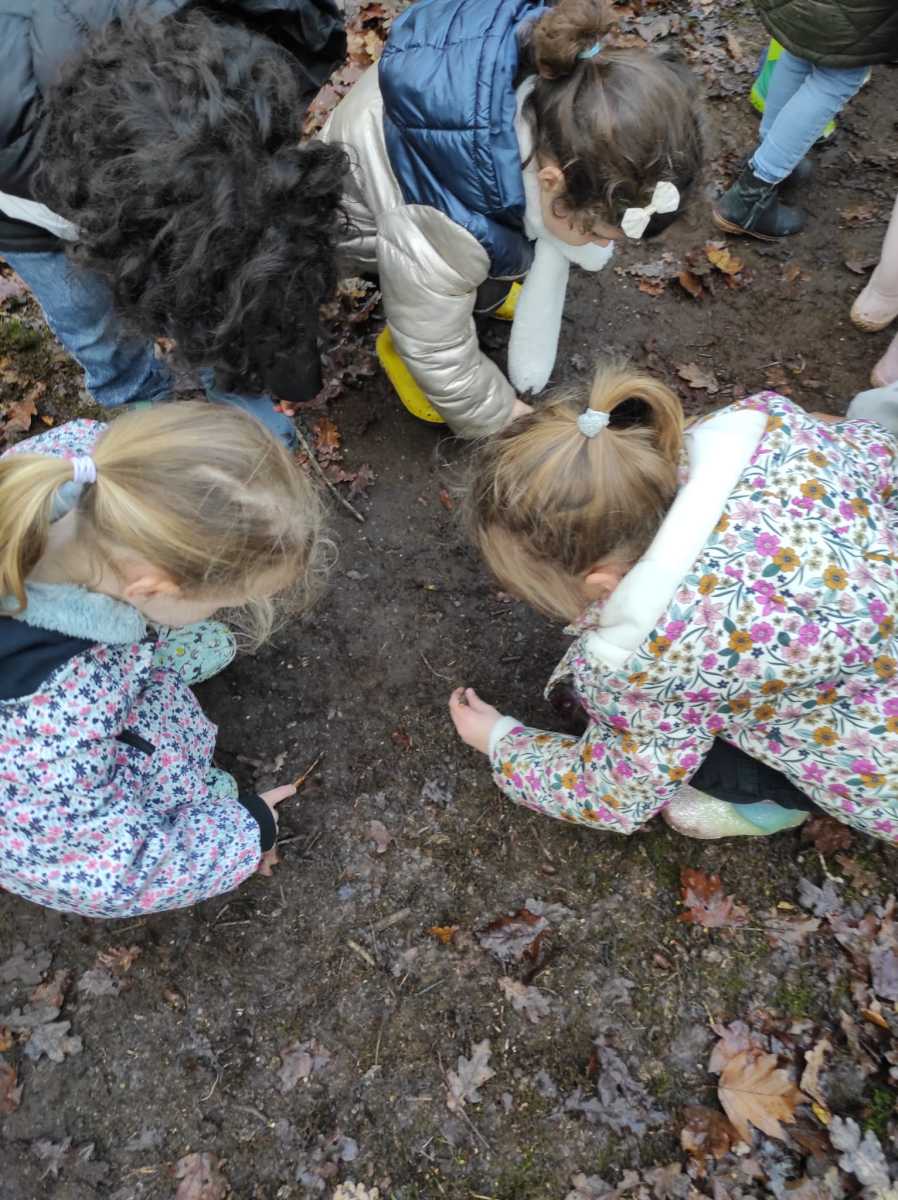 Dans le chemin, chacun a trouvé un morceau de bois afin de tracer dans la terre : des traits verticaux/horizontaux/obliques, des lignes brisées, des boucles (un peu plus difficile) et son prénom.