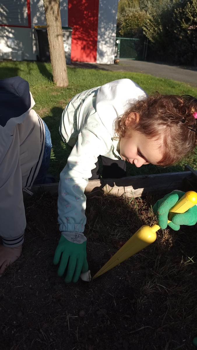 Puis, à l’aide d’un plantoir, nous avons creusé des trous et déposé nos bulbes avec la pointe vers le haut.