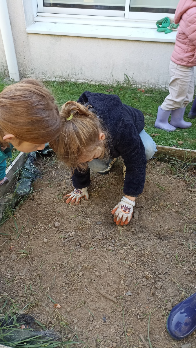 Puis, à l’aide d’un plantoir, nous avons creusé des trous et déposé nos bulbes avec la pointe vers le haut.