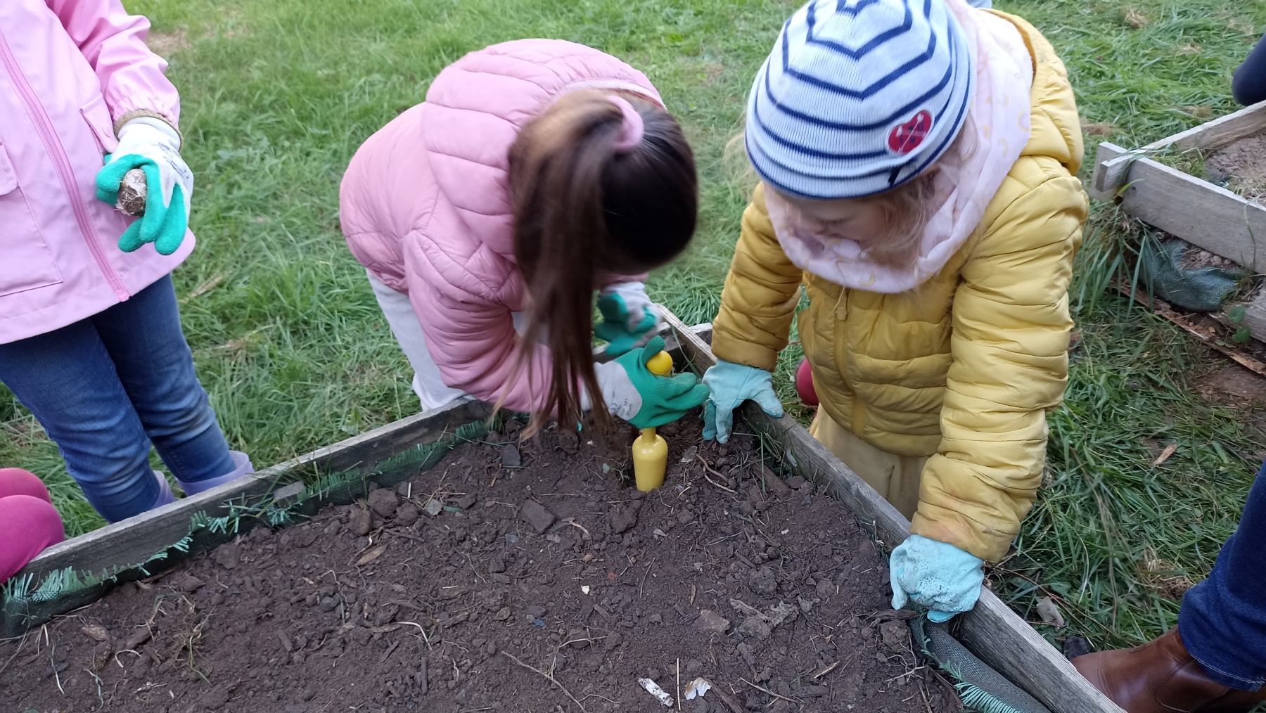 Puis, à l’aide d’un plantoir, nous avons creusé des trous et déposé nos bulbes avec la pointe vers le haut.