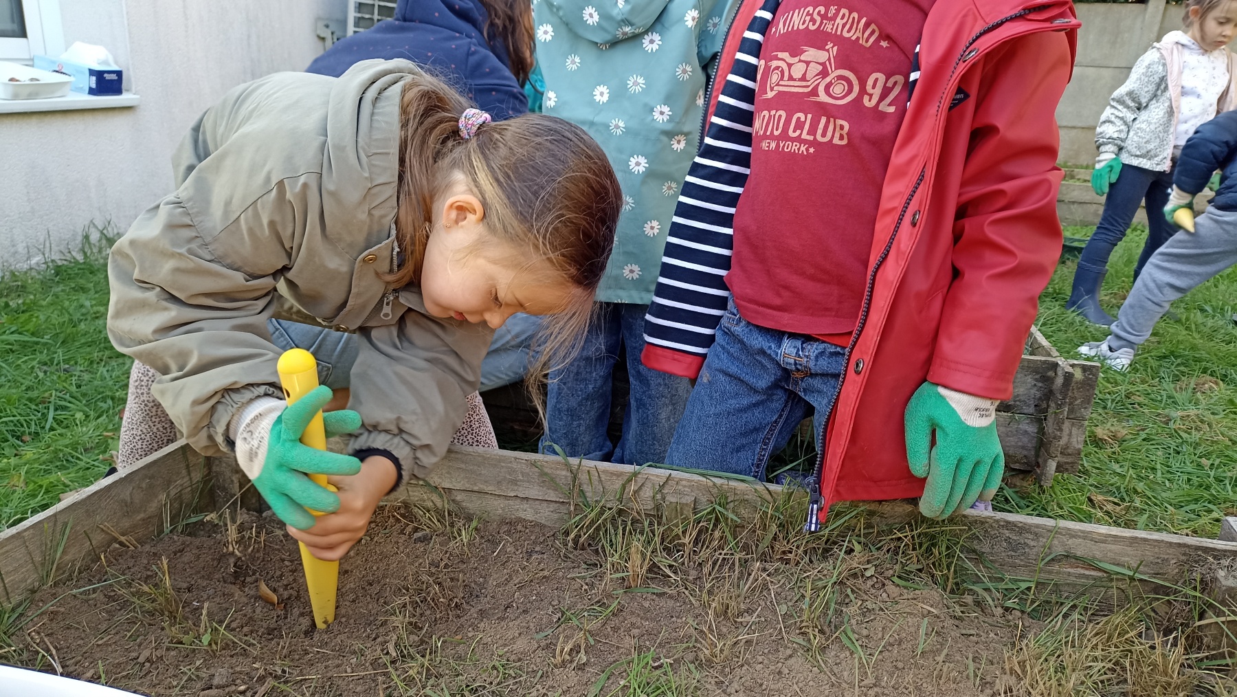 Puis, à l’aide d’un plantoir, nous avons creusé des trous et déposé nos bulbes avec la pointe vers le haut.