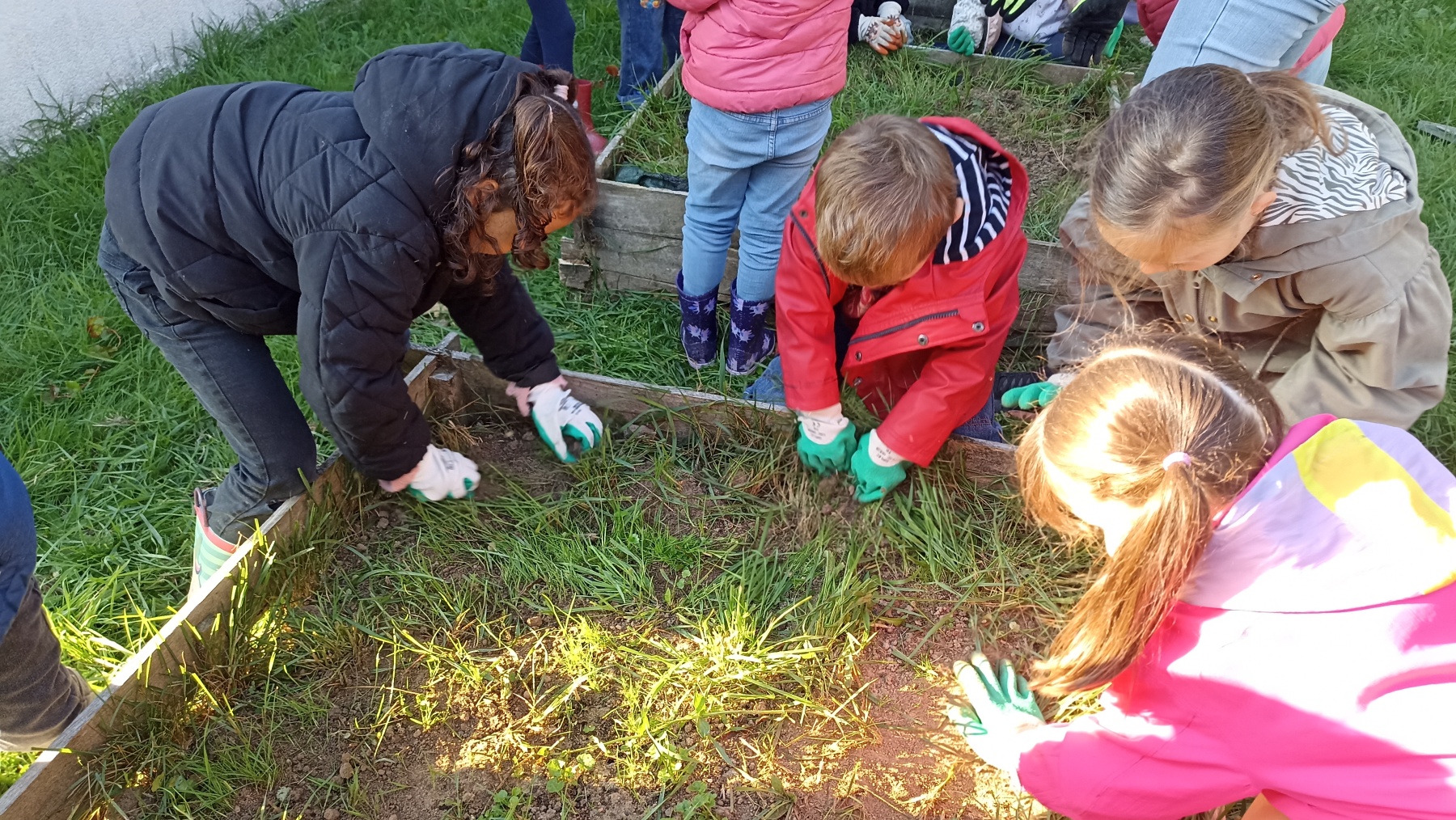 Puis, à l’aide d’un plantoir, nous avons creusé des trous et déposé nos bulbes avec la pointe vers le haut.