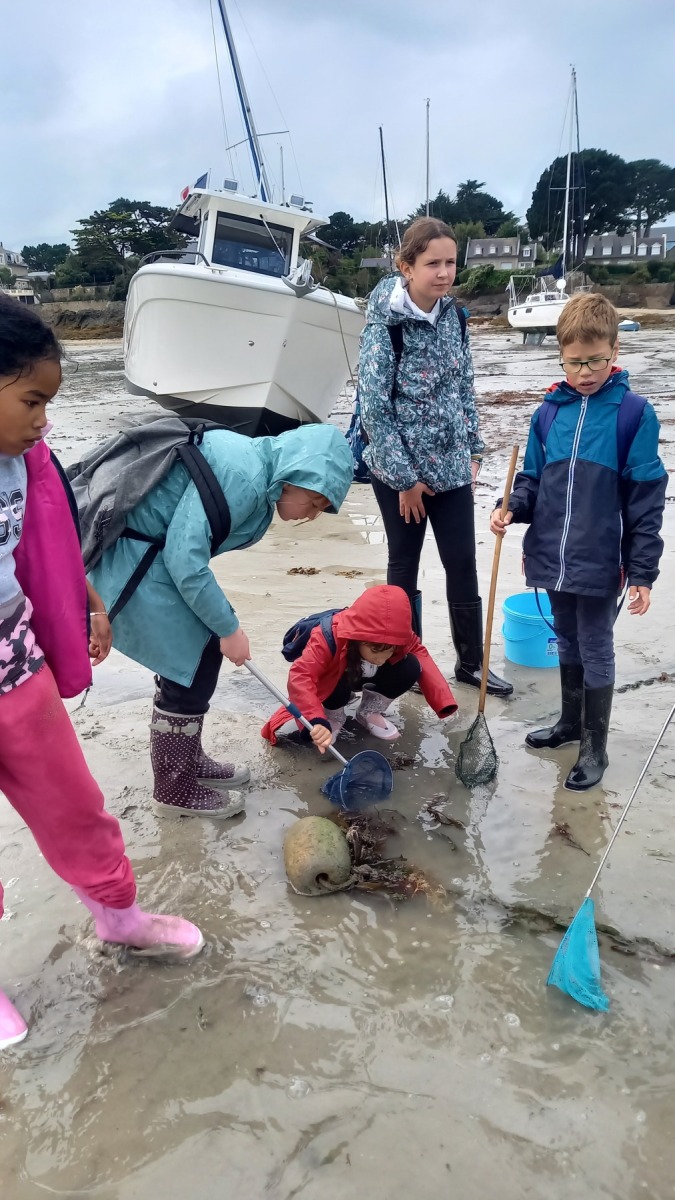 Nous avons pris le goûter sur la plage sous un beau soleil, puis nous sommes retournés au Manoir avec notre pêche. Nous avons ainsi pu créer un aquarium d’eau de mer, que nous observerons jusqu’à la fin de la semaine avant de tout remettre à la mer.