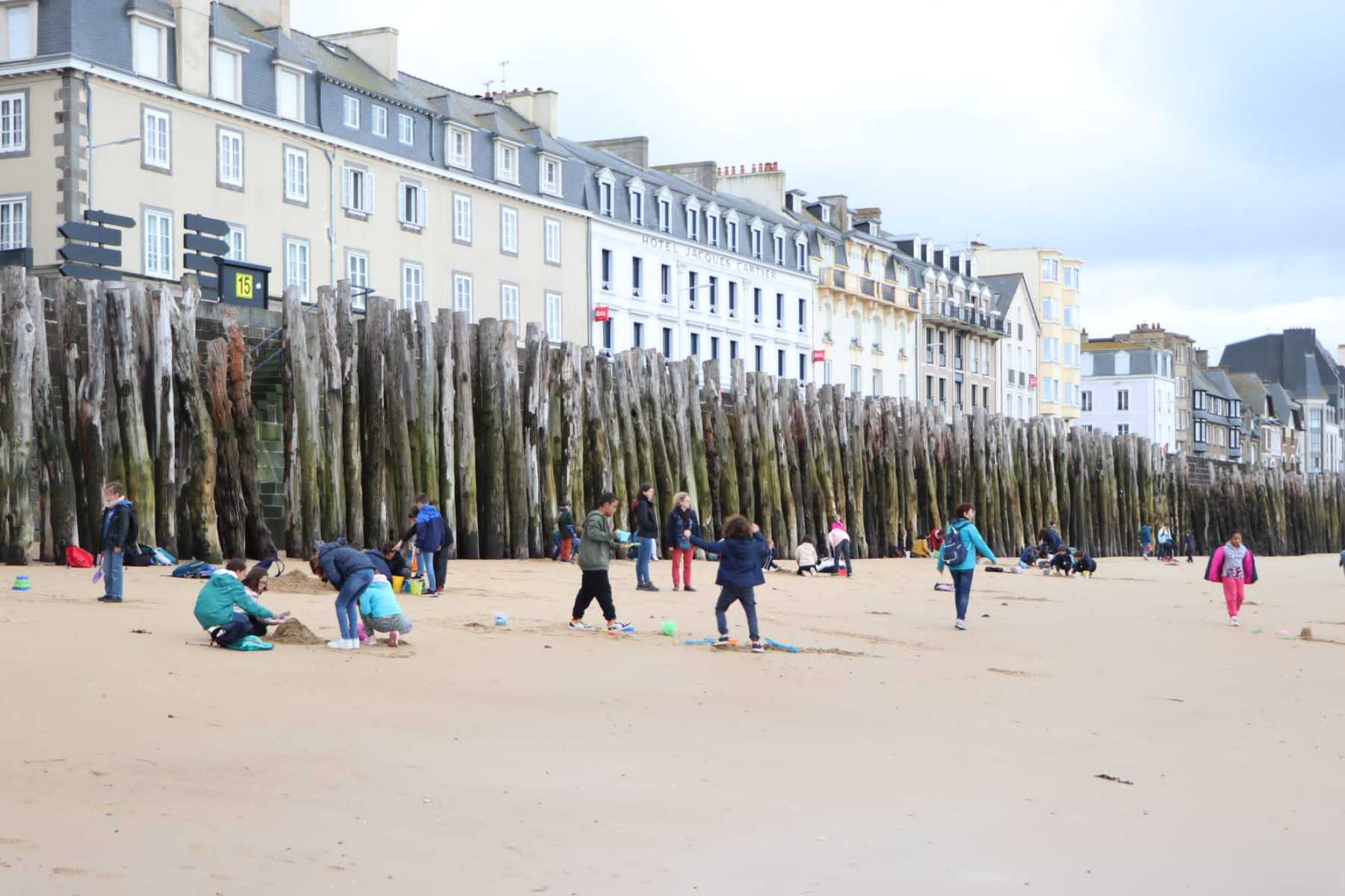 Après une longue et bonne nuit de sommeil, qui a permis de bien recharger les batteries pour tout le monde, nous nous sommes rendus sur la grande plage de Saint-Malo pour enfin faire notre concours de châteaux de sable. Munis de nos nombreux outils, nous avons réalisés de belles constructions (Mont Saint-Michel, ville de Saint-Malo, ville fortifiée, Carcassonne, village, châteaux…). Il a été très difficile de départager ces belles réalisations. Bravo à tous !