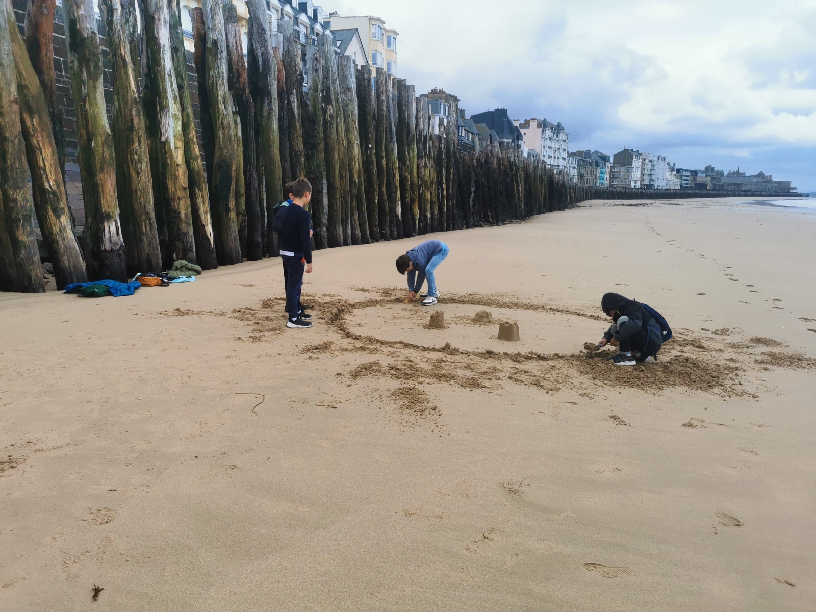 Après une longue et bonne nuit de sommeil, qui a permis de bien recharger les batteries pour tout le monde, nous nous sommes rendus sur la grande plage de Saint-Malo pour enfin faire notre concours de châteaux de sable. Munis de nos nombreux outils, nous avons réalisés de belles constructions (Mont Saint-Michel, ville de Saint-Malo, ville fortifiée, Carcassonne, village, châteaux…). Il a été très difficile de départager ces belles réalisations. Bravo à tous !