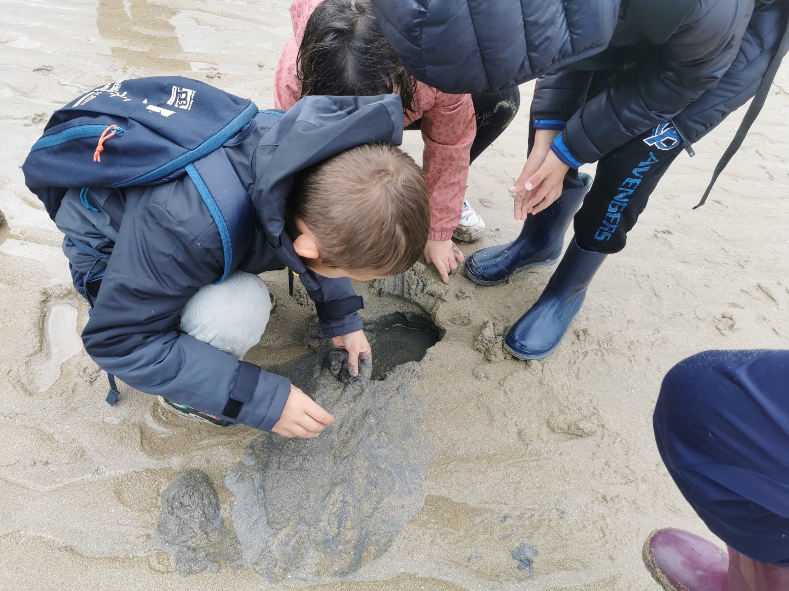 Chaussés de nos bottes et munis de seaux et épuisettes, nous sommes partis nous balader sur les rochers et la plage à la recherche d’animaux marins : de nombreuses crevettes et petits poissons, des coques, des bigorneaux, des patelles, des palourdes, des crabes, des anémones.. Après une petite averse qui nous a bien arrosé, le soleil est revenu pour terminer la pêche les pieds au sec, ou presque…