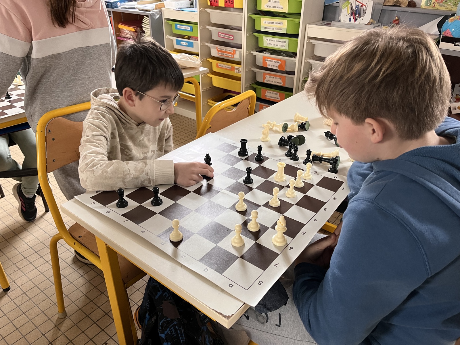 Depuis la rentrée de janvier, les classes de CE2 et CM1-CM2 ont débuté l’apprentissage des échecs grâce à l’intervention d’Anatole tous les mardis après-midis. Petit à petit nous avons découvert les différentes pièces et leurs possibilités de déplacement.