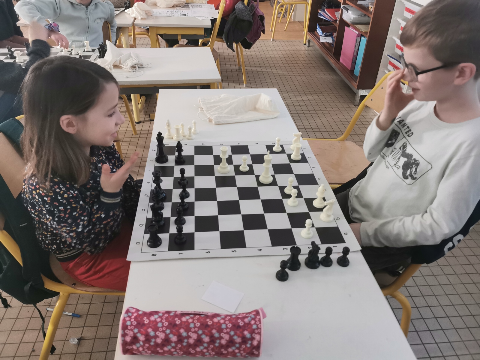 Depuis la rentrée de janvier, les classes de CE2 et CM1-CM2 ont débuté l’apprentissage des échecs grâce à l’intervention d’Anatole tous les mardis après-midis. Petit à petit nous avons découvert les différentes pièces et leurs possibilités de déplacement.