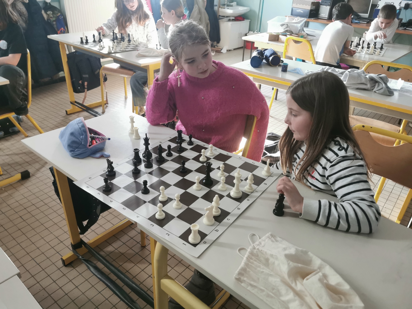 Depuis la rentrée de janvier, les classes de CE2 et CM1-CM2 ont débuté l’apprentissage des échecs grâce à l’intervention d’Anatole tous les mardis après-midis. Petit à petit nous avons découvert les différentes pièces et leurs possibilités de déplacement.