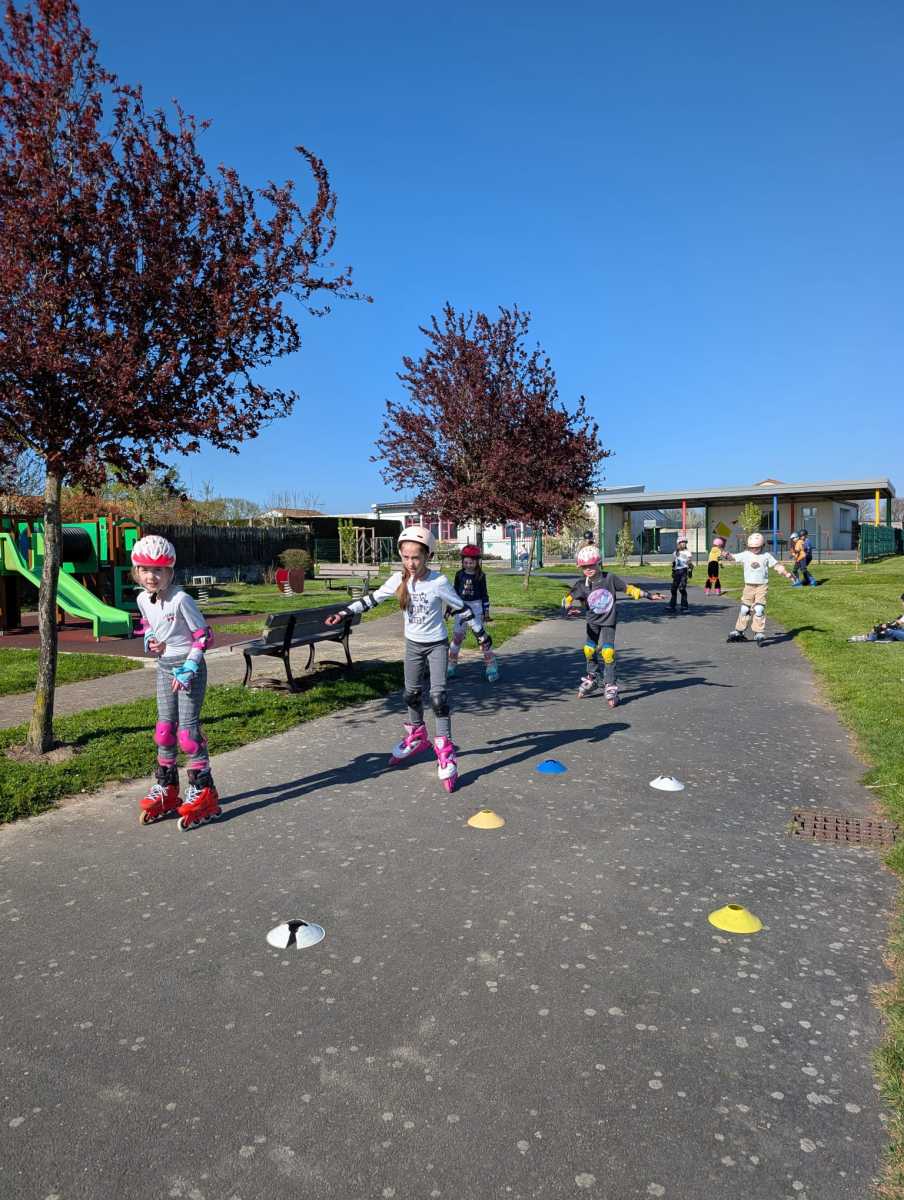 Ils ont pu apprendre à avancer sur des rollers, s’arrêter, faire des slaloms, se laisser glisser en se faisant tirer par un camarade, faire des relais… Les enfants ont adoré malgré les nombreuses chutes.