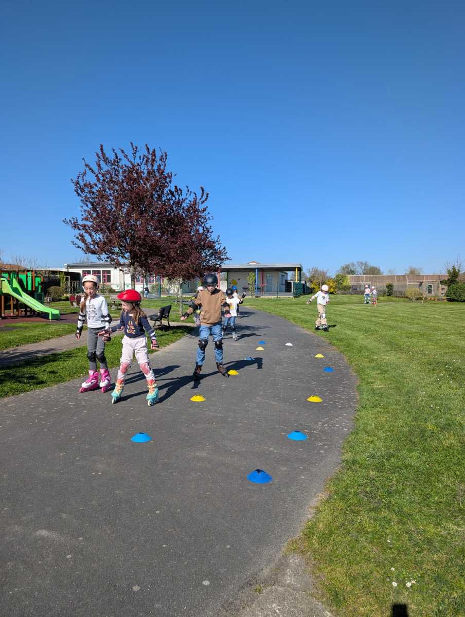 Ils ont pu apprendre à avancer sur des rollers, s’arrêter, faire des slaloms, se laisser glisser en se faisant tirer par un camarade, faire des relais… Les enfants ont adoré malgré les nombreuses chutes.