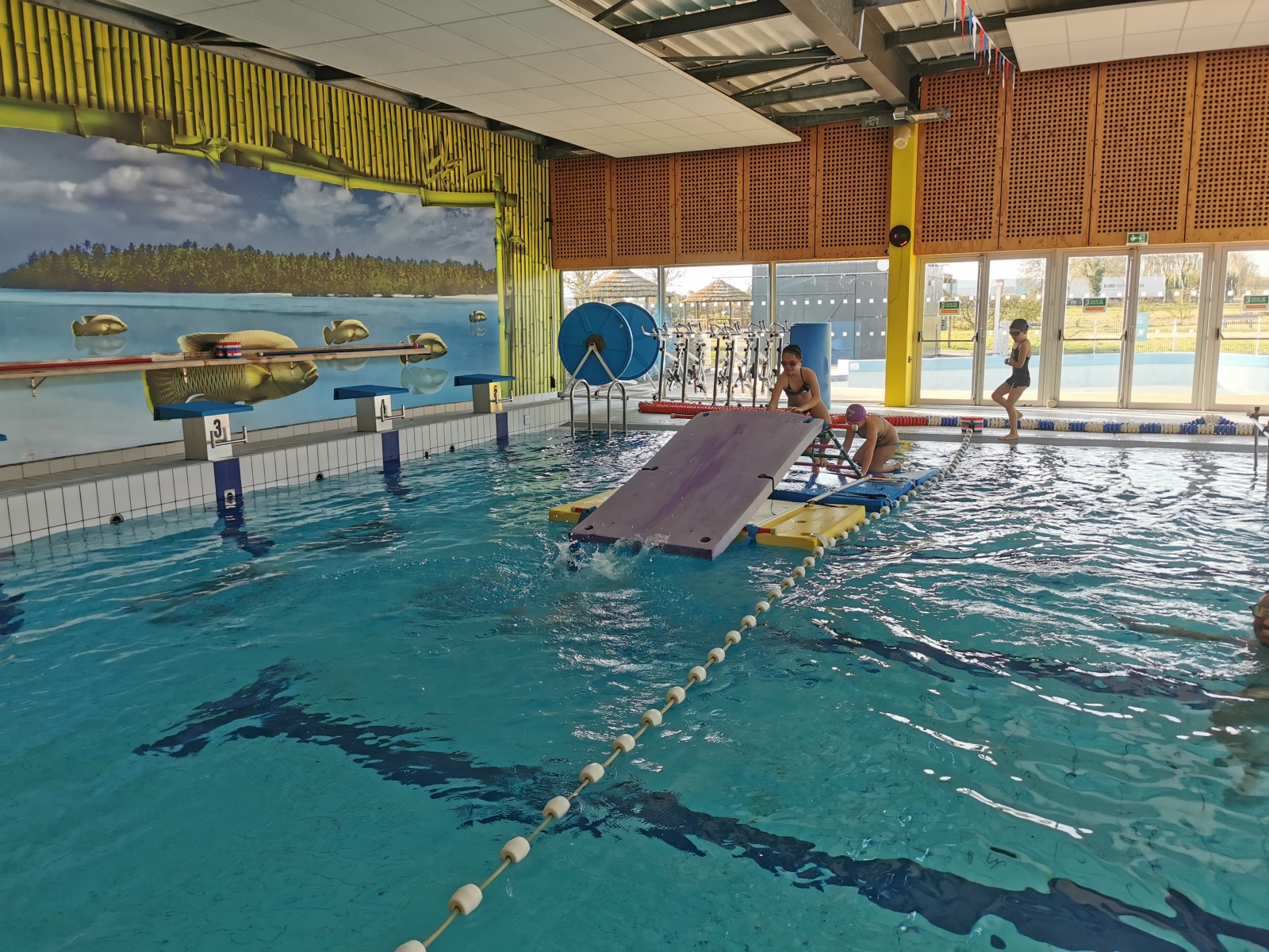 Lors de la dernière séance, nous avons eu la chance d’avoir un parcours ludique dans le grand bassin : structure à traverser, tapis, toboggan, cage… Et pour notre plus grand bonheur on a terminé dans le petit bain !