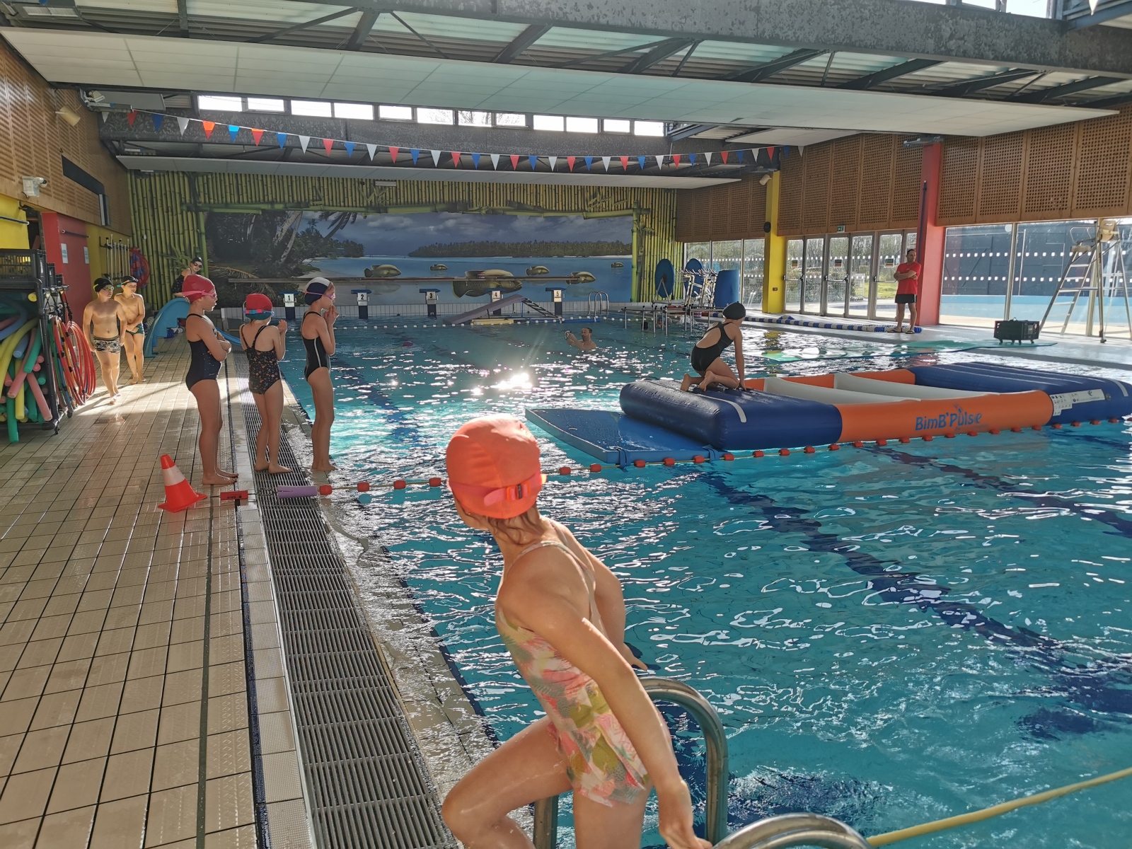 Lors de la dernière séance, nous avons eu la chance d’avoir un parcours ludique dans le grand bassin : structure à traverser, tapis, toboggan, cage… Et pour notre plus grand bonheur on a terminé dans le petit bain !