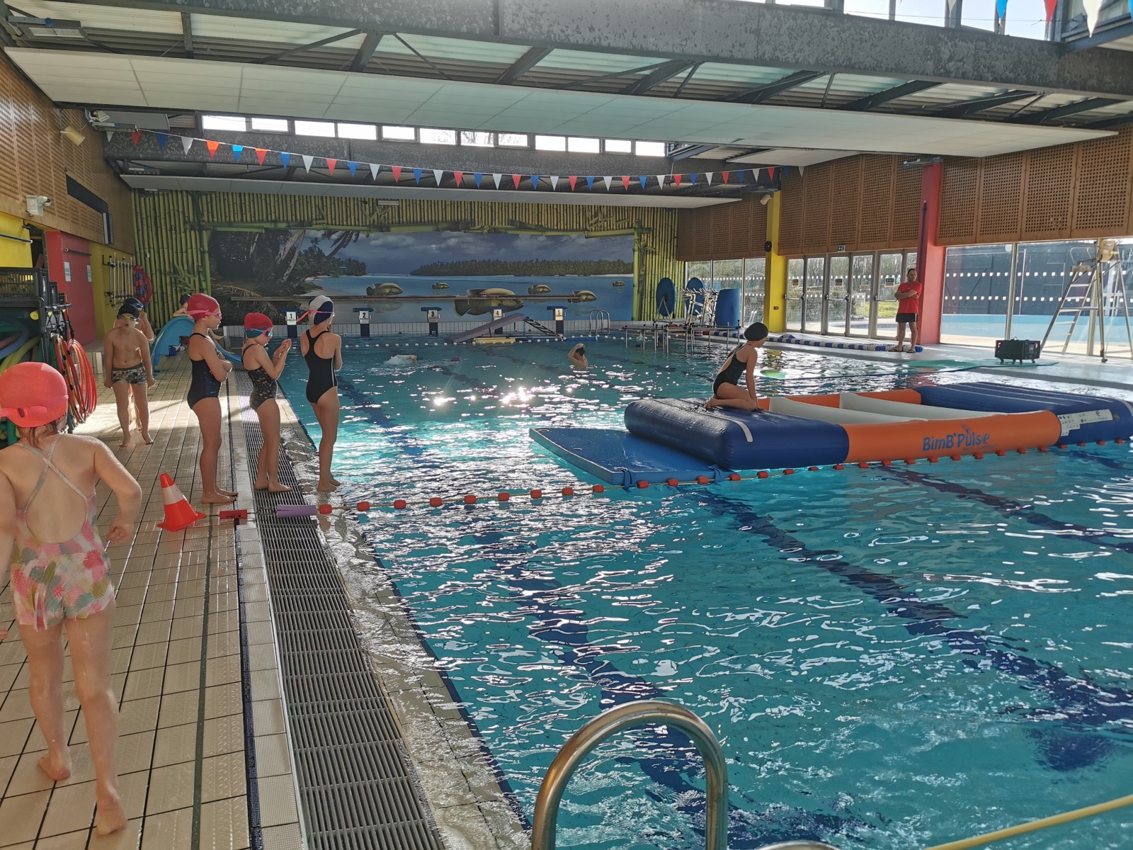 Lors de la dernière séance, nous avons eu la chance d’avoir un parcours ludique dans le grand bassin : structure à traverser, tapis, toboggan, cage… Et pour notre plus grand bonheur on a terminé dans le petit bain !