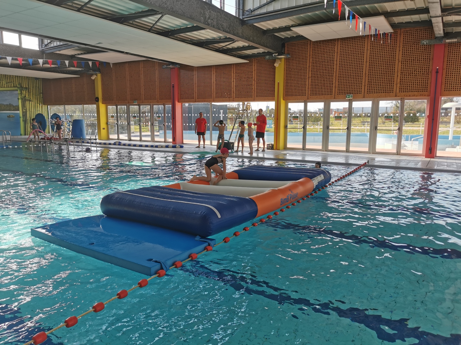 Lors de la dernière séance, nous avons eu la chance d’avoir un parcours ludique dans le grand bassin : structure à traverser, tapis, toboggan, cage… Et pour notre plus grand bonheur on a terminé dans le petit bain !