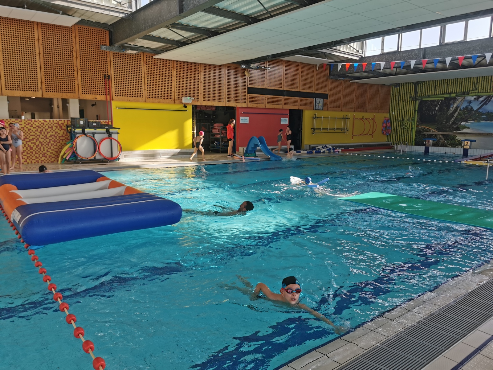 Lors de la dernière séance, nous avons eu la chance d’avoir un parcours ludique dans le grand bassin : structure à traverser, tapis, toboggan, cage… Et pour notre plus grand bonheur on a terminé dans le petit bain !