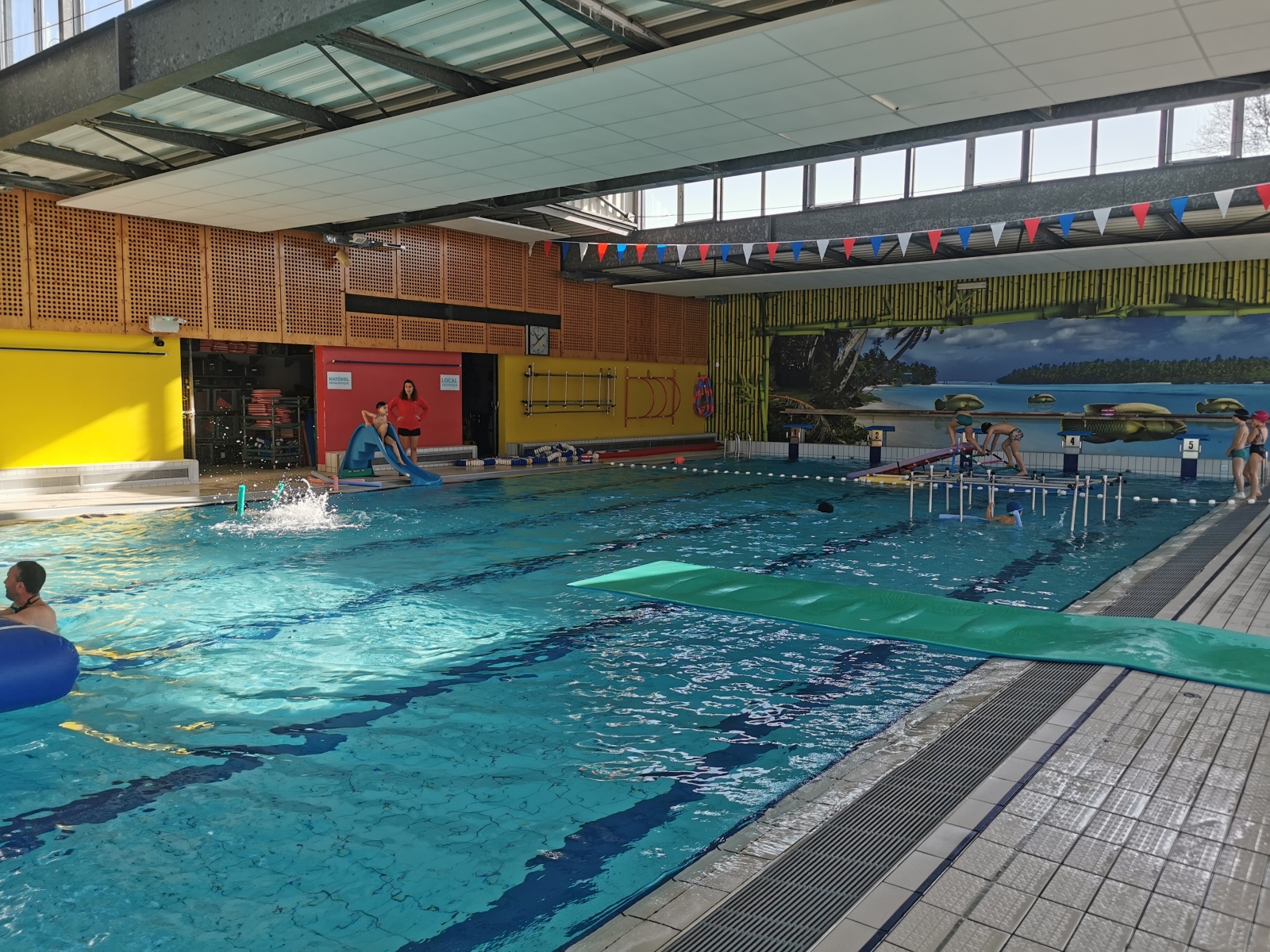 Lors de la dernière séance, nous avons eu la chance d’avoir un parcours ludique dans le grand bassin : structure à traverser, tapis, toboggan, cage… Et pour notre plus grand bonheur on a terminé dans le petit bain !