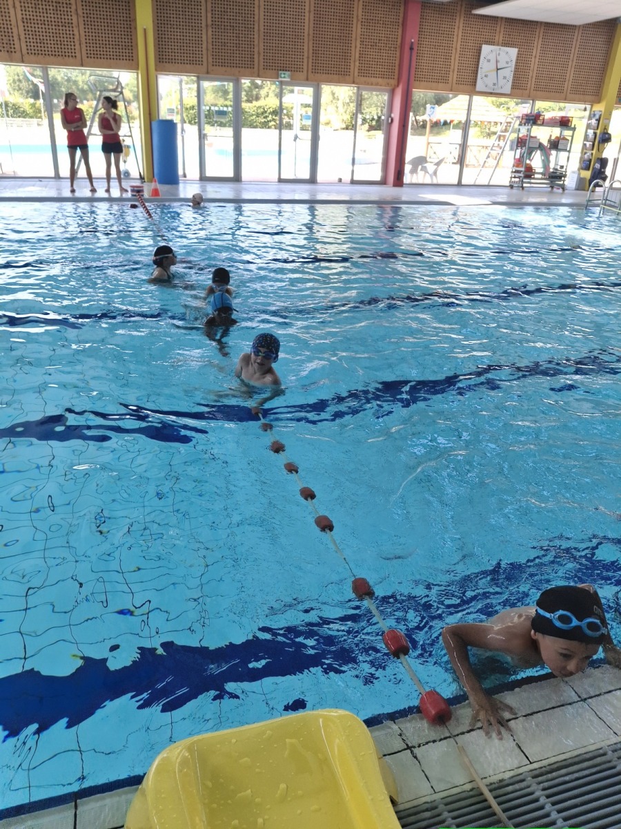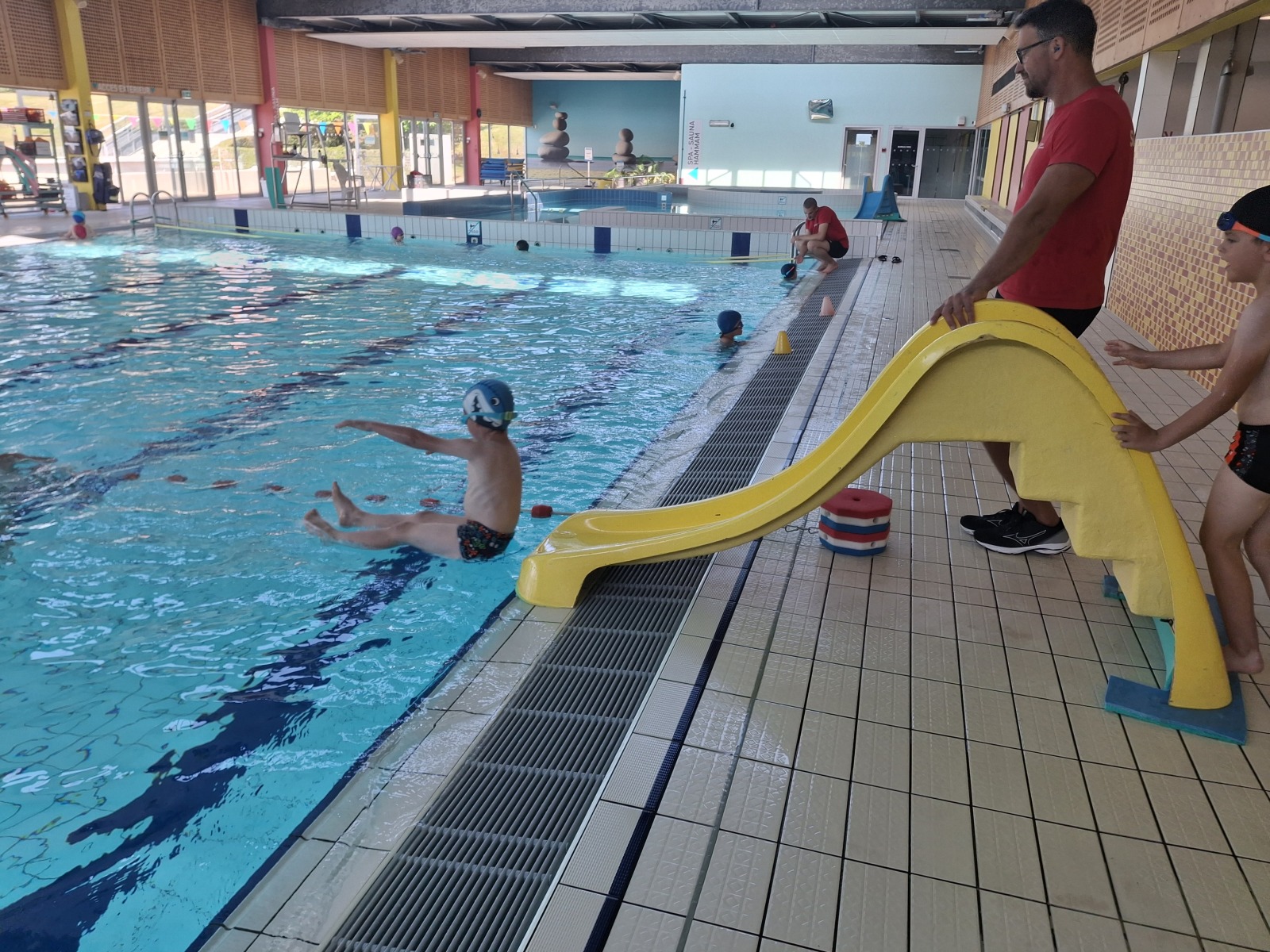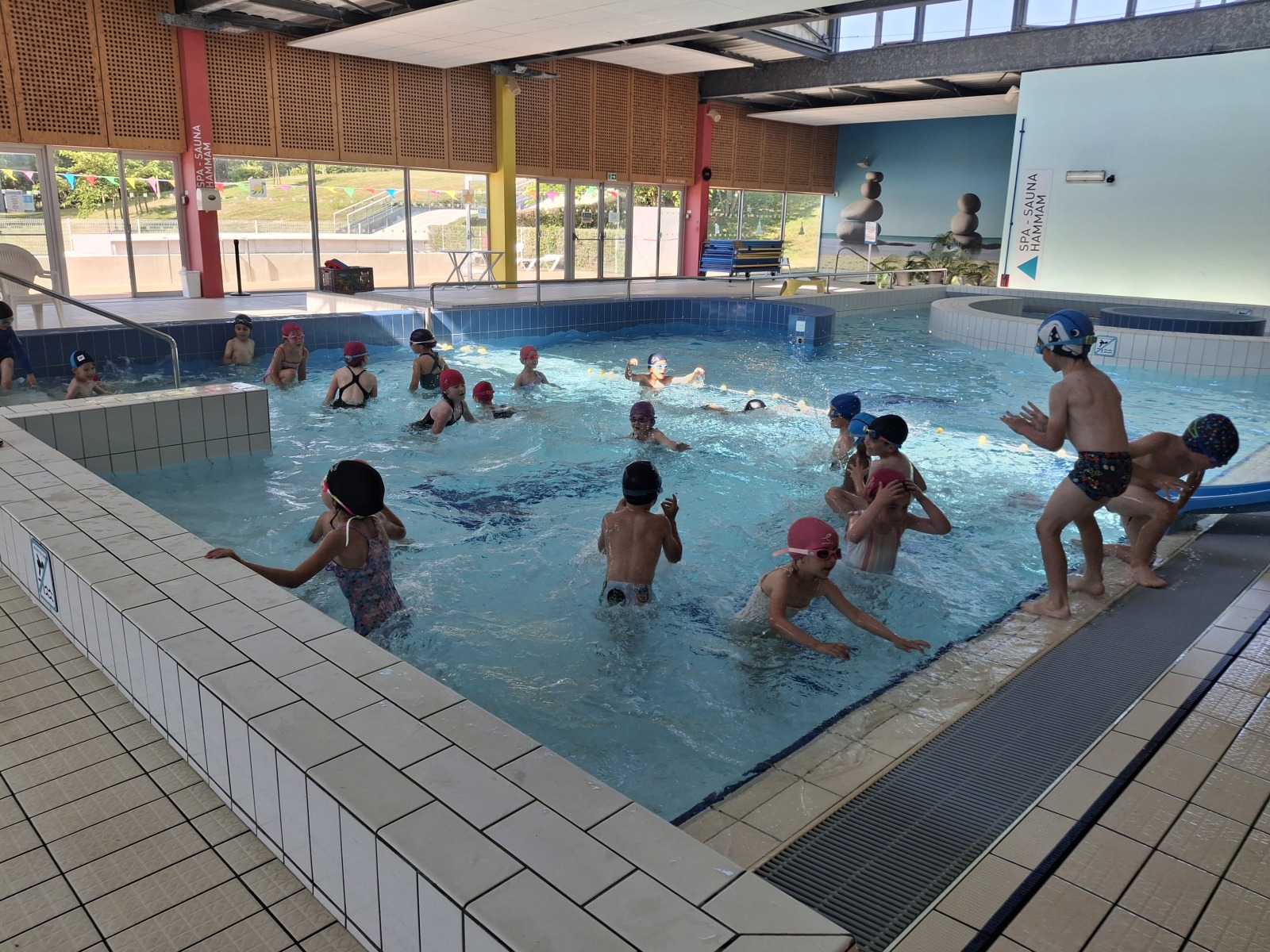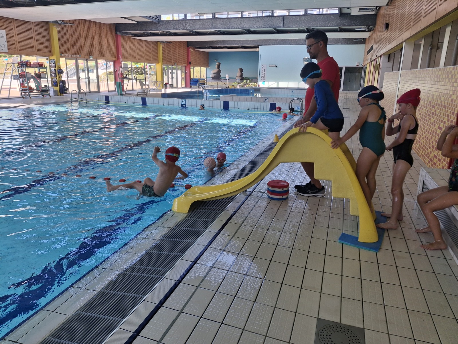 Le but : être à l’aise dans l’eau et réussir avant tout à mettre la tête dans l’eau. Peu d’enfants n’y arrivent pas et tous ont progressé grâce aux différents ateliers dans le grand bassin :