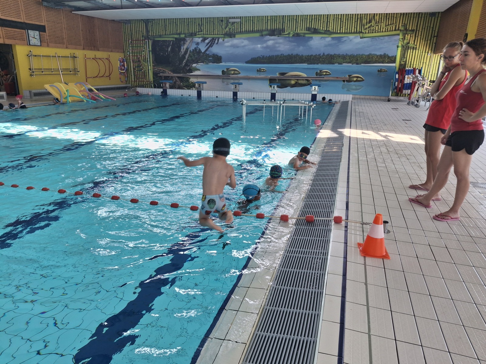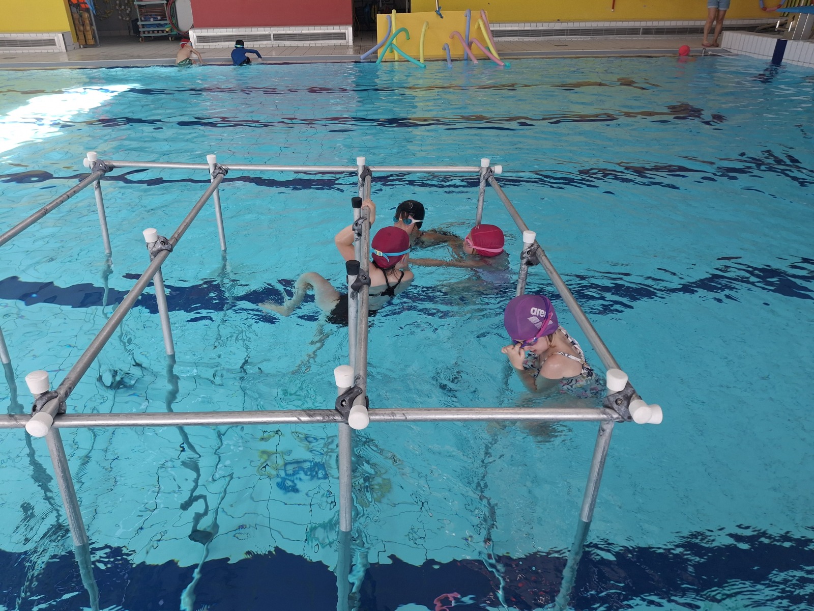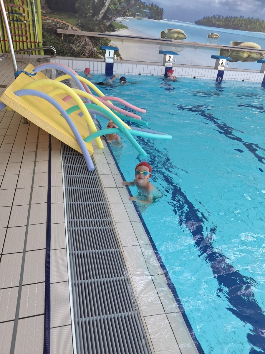 Le but : être à l’aise dans l’eau et réussir avant tout à mettre la tête dans l’eau. Peu d’enfants n’y arrivent pas et tous ont progressé grâce aux différents ateliers dans le grand bassin :