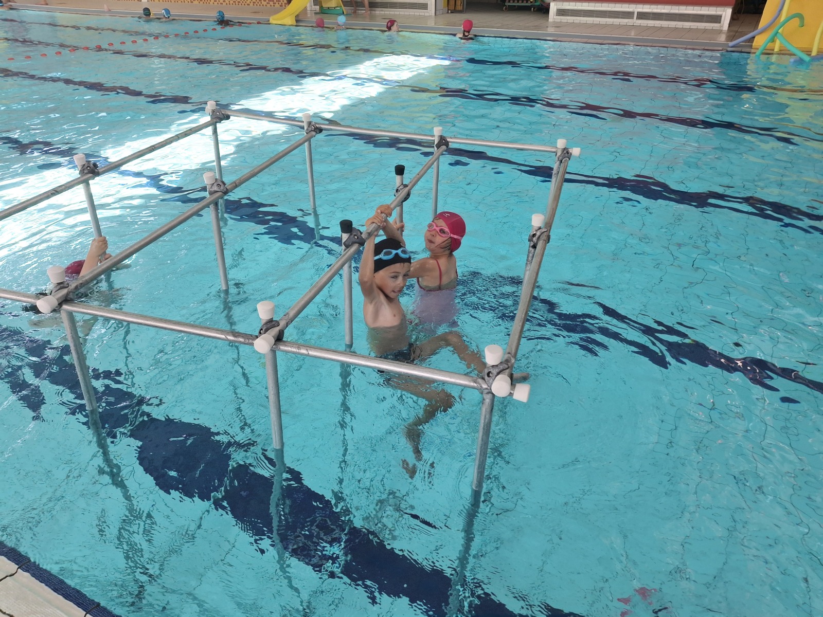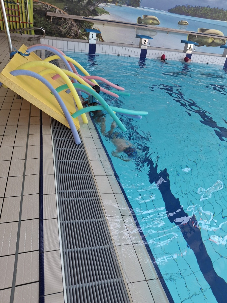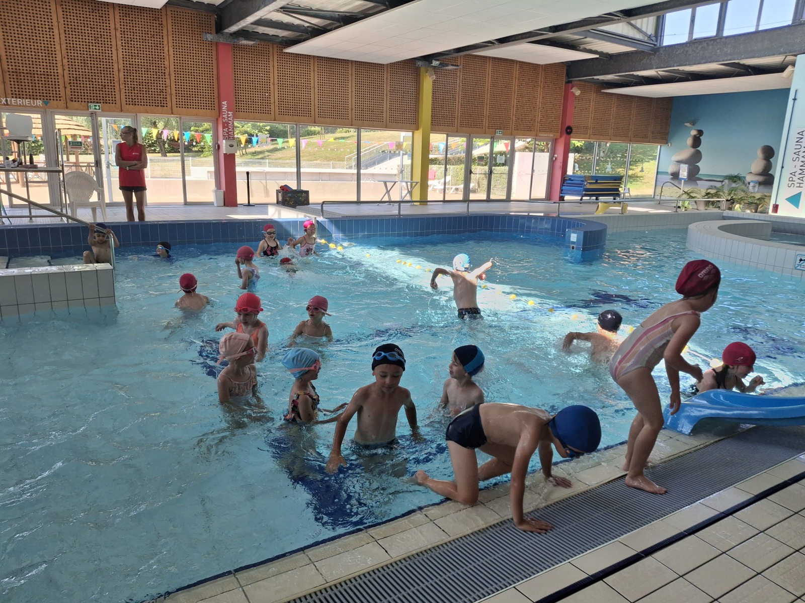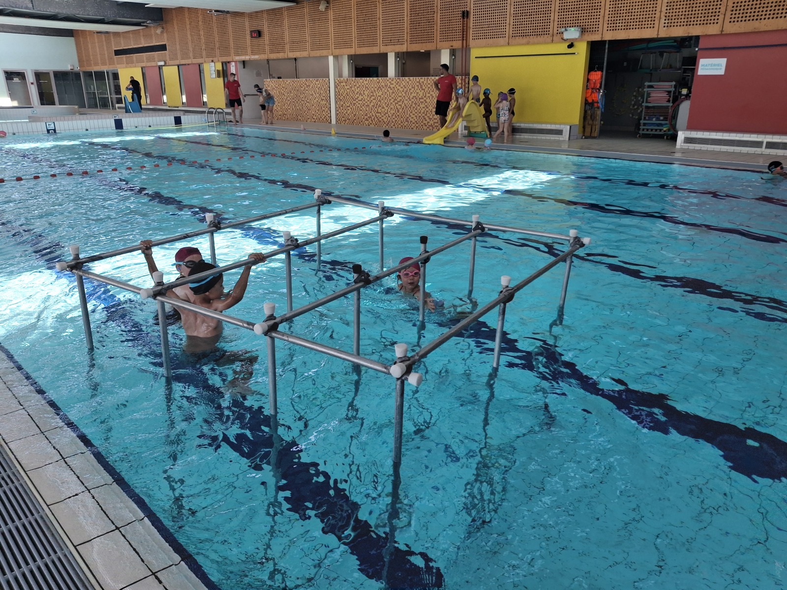 Le but : être à l’aise dans l’eau et réussir avant tout à mettre la tête dans l’eau. Peu d’enfants n’y arrivent pas et tous ont progressé grâce aux différents ateliers dans le grand bassin :