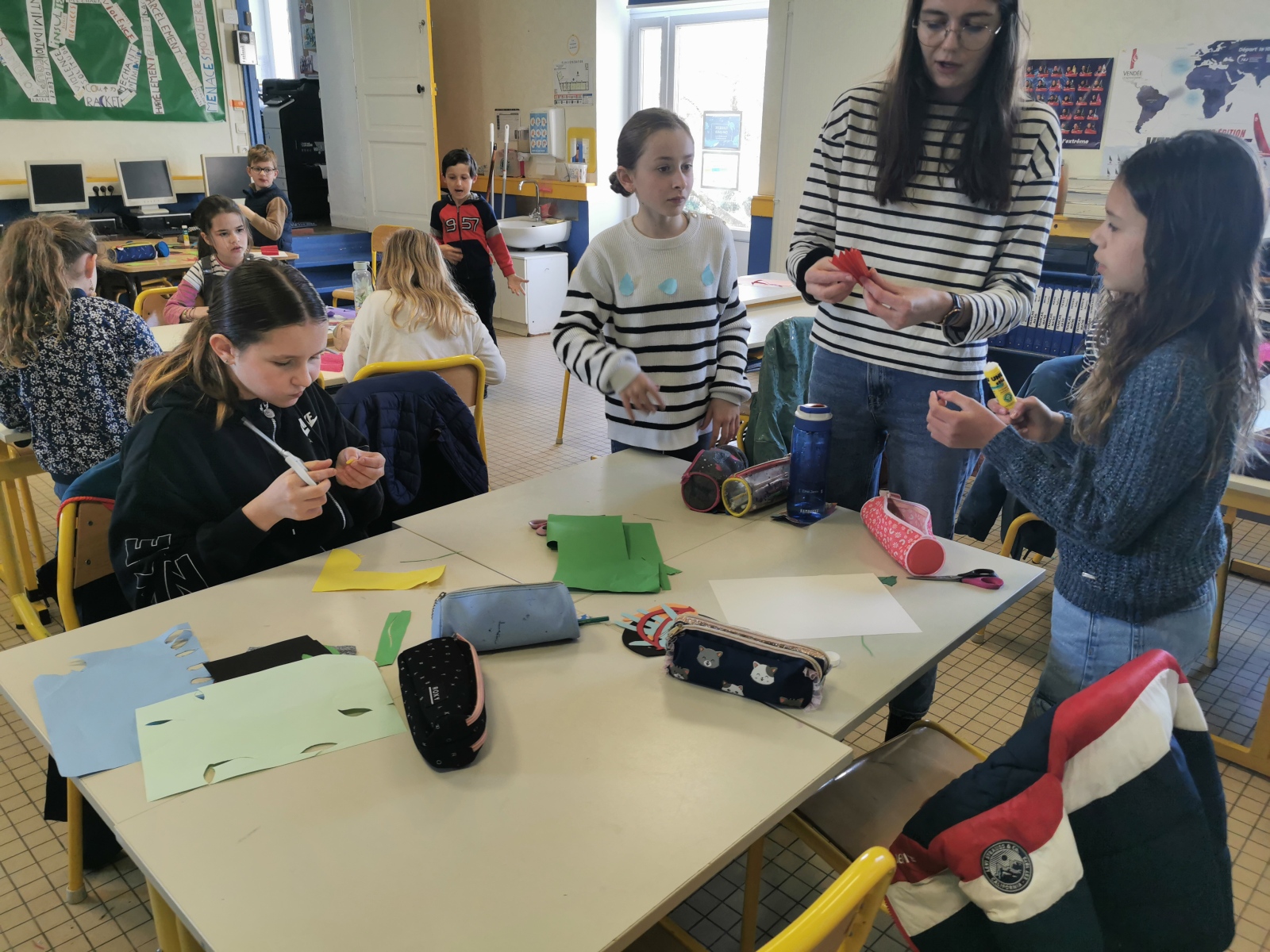 Les élèves de CE2, CM1 et CM2 ont pu participer ensemble à des ateliers de bricolage sur le thème du printemps et du carnaval en réalisant des masques, des pots de fleurs et des oiseaux. Leurs beaux travaux décorent maintenant nos classes.