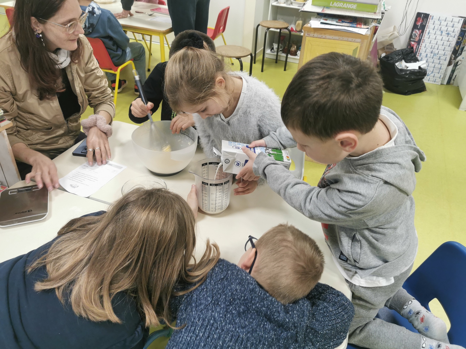 Le jeudi 12 février, les classes de MS-GS (Claire) et de CE2 (Ophélie) se sont réunies pour préparer des crêpes. Ils ont bien mélangé pour ne pas avoir des grumeaux.