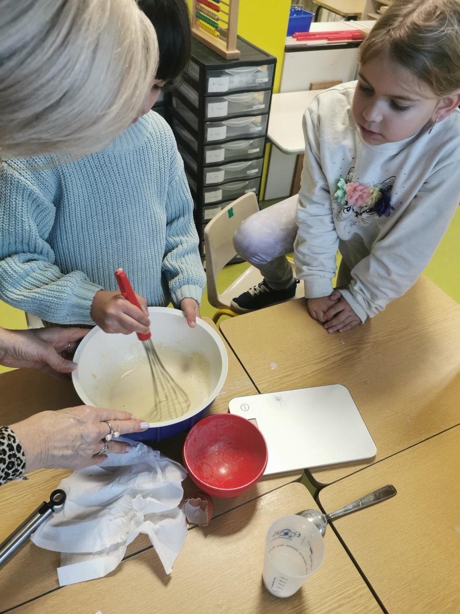 Le jeudi 12 février, les classes de MS-GS (Claire) et de CE2 (Ophélie) se sont réunies pour préparer des crêpes. Ils ont bien mélangé pour ne pas avoir des grumeaux.