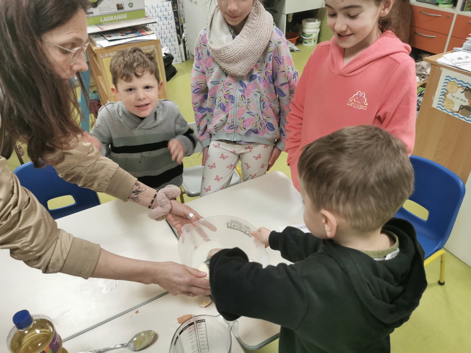 Le jeudi 12 février, les classes de MS-GS (Claire) et de CE2 (Ophélie) se sont réunies pour préparer des crêpes. Ils ont bien mélangé pour ne pas avoir des grumeaux.