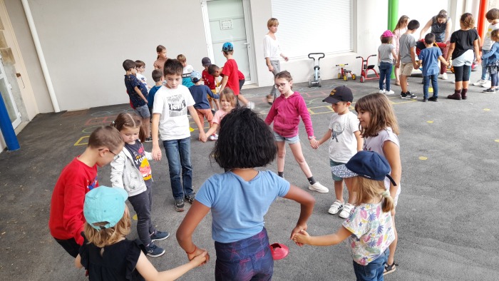 Cette première rencontre nous a permis de faire connaissance : chaque MS et chaque GS constitue un binôme avec un CE2. Ce jeudi, nous nous sommes également entraîner au jeu du cerceau pour le lendemain.