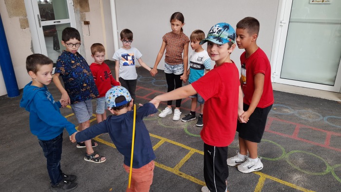 Cette première rencontre nous a permis de faire connaissance : chaque MS et chaque GS constitue un binôme avec un CE2. Ce jeudi, nous nous sommes également entraîner au jeu du cerceau pour le lendemain.