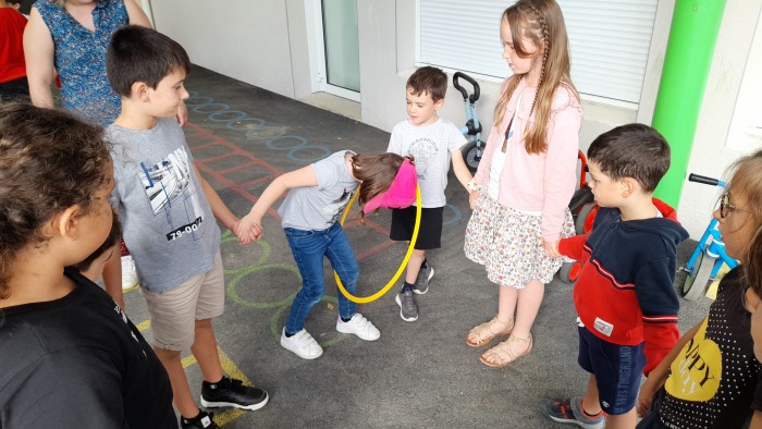 Cette première rencontre nous a permis de faire connaissance : chaque MS et chaque GS constitue un binôme avec un CE2. Ce jeudi, nous nous sommes également entraîner au jeu du cerceau pour le lendemain.