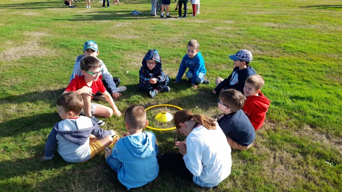Cette première rencontre nous a permis de faire connaissance : chaque MS et chaque GS constitue un binôme avec un CE2. Ce jeudi, nous nous sommes également entraîner au jeu du cerceau pour le lendemain.