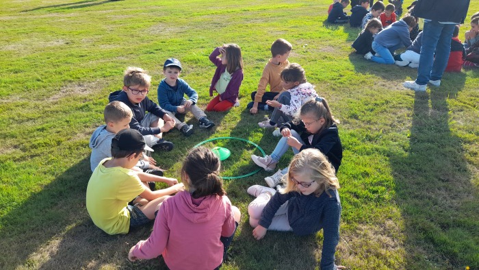Cette première rencontre nous a permis de faire connaissance : chaque MS et chaque GS constitue un binôme avec un CE2. Ce jeudi, nous nous sommes également entraîner au jeu du cerceau pour le lendemain.