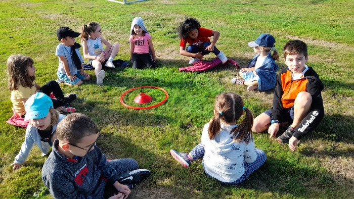 Cette première rencontre nous a permis de faire connaissance : chaque MS et chaque GS constitue un binôme avec un CE2. Ce jeudi, nous nous sommes également entraîner au jeu du cerceau pour le lendemain.