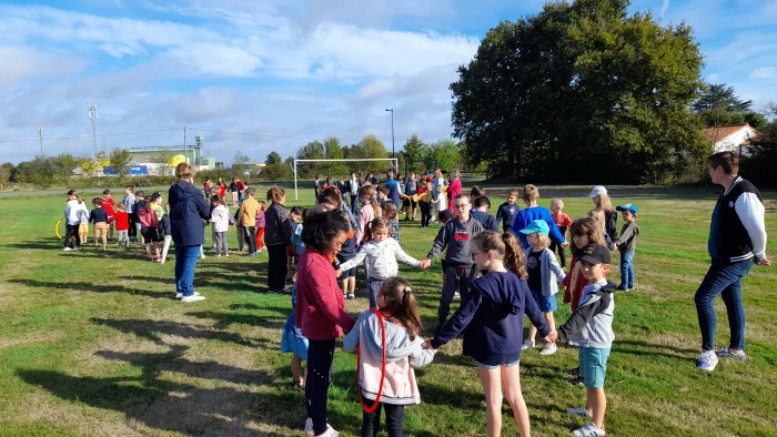 En effet, vendredi, tous les élèves de l’école se sont regroupés sur le terrain à côté de la salle de sports pour fêter cette nouvelle année : Plus vite, plus haut, plus fort ! Tous ensemble !